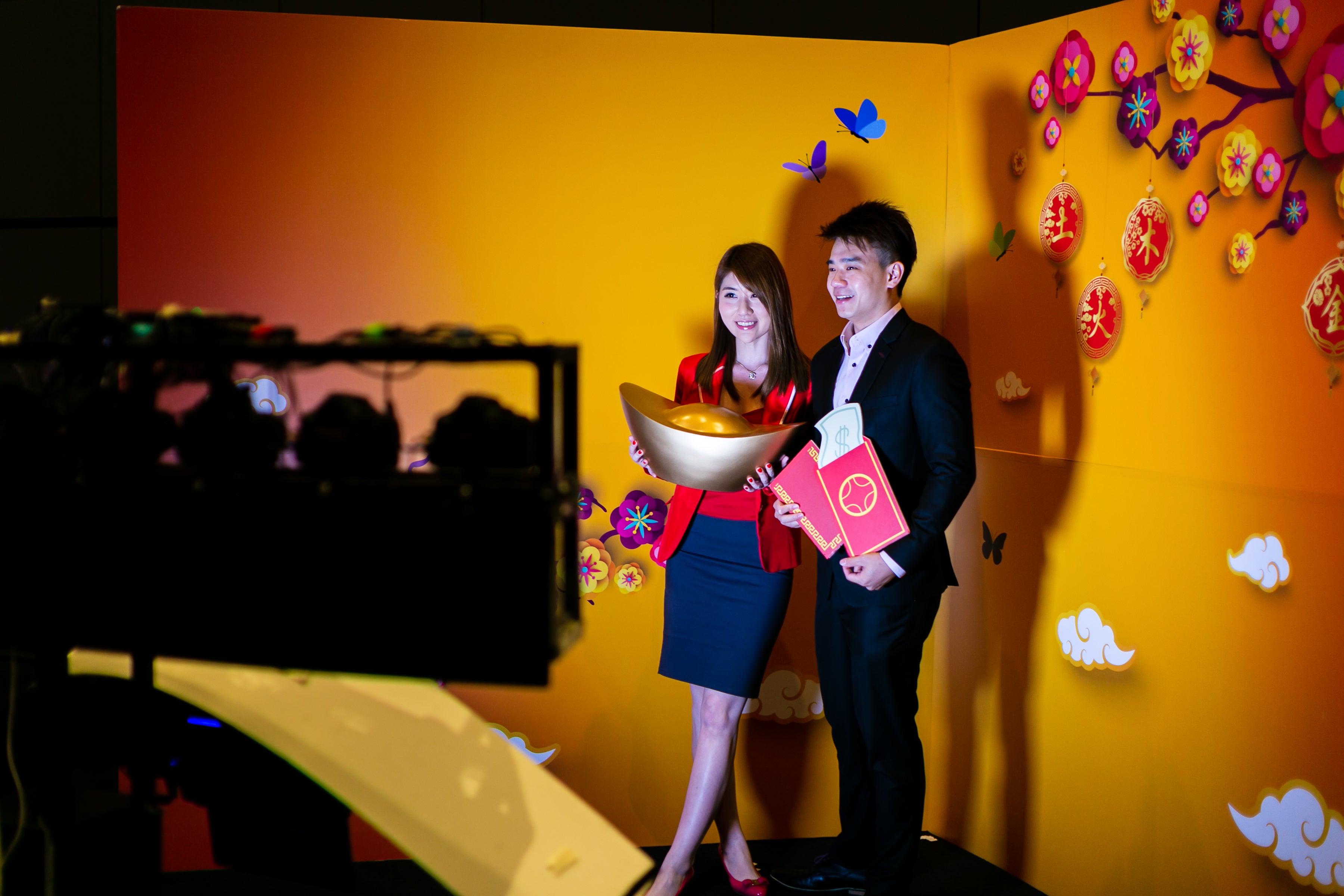 Right outside the dining hall, guests were greeted by a grand arch as well as four "God of Fortune" roving mascots that served as the first photo opportunity of the day. The stage backdrop made use of projection mapping to bring the five elements of wood, fire, earth, metal, and water to live. Guests feeling "huat" could also try their luck at the Lucky Wind Chamber where great prizes were up for grabs, literally, or at the Lucky Spin Wheel.